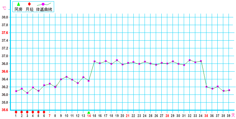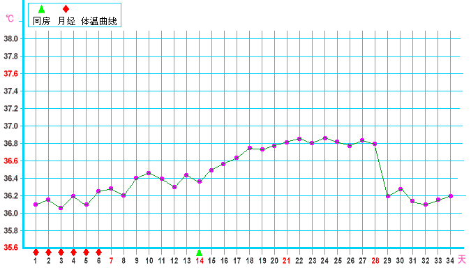 女性月經周期以月經見紅第一天為周期的開始,周期的長短因人而異,約為21-35天不等,平均約為28天,其中又以排卵日為分隔,分為排卵前的濾泡期,與排卵后的黃體期。濾泡期長短不一定,但黃體期固定約為14天上下兩天。排卵后次日,因卵巢形成黃體,分泌黃體素會使體溫上升攝氏0。6度左右,而使體溫呈現高低兩相變化。高溫期約持續12-16天(平均14天)。